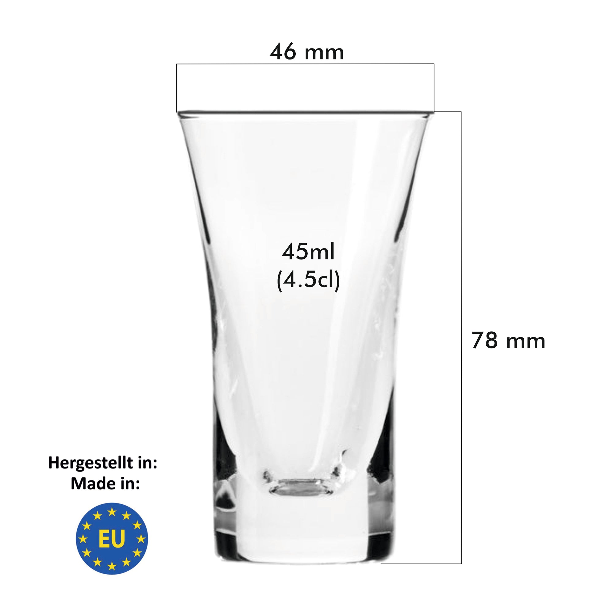 TECHNISCHE PARAMETER: Anzahl der Teile im Set: 6. Fassungsvermögen: 45 ml. Höhe des einzelnen Glases: 78 mm. Durchmesser: 46 mm. Die Gläser können in der Spülmaschine gereinigt werden. Hergestellt in der EU.